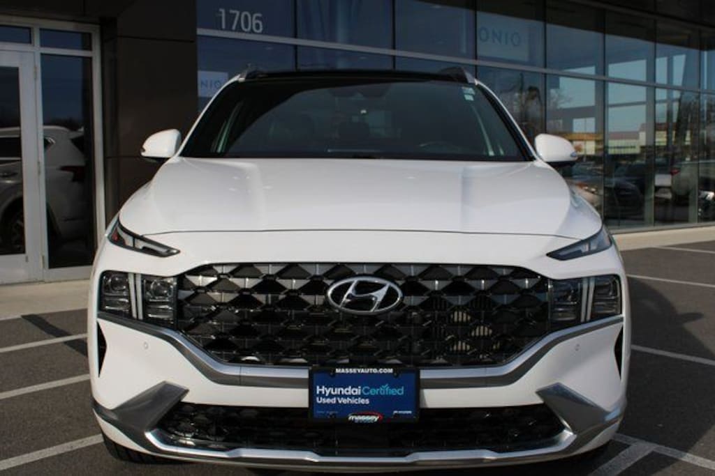 Recent Arrival! Clean CARFAX. 21/28 City/Highway MPG 2023 Hyundai Santa Fe Calligraphy Serenity White Pearl AWD 2.5L I4 Shiftronic Calligraphy AWD, Black Leather, 12 Speakers, 4-Wheel Disc Brakes, ABS brakes, Air Conditioning, Alloy wheels, AM/FM radio: SiriusXM, Apple CarPlay & Android Auto, Auto High-beam Headlights, Auto-dimming Rear-View mirror, Automatic temperature control, Axle Ratio: 3.316, Brake assist, Bumpers: body-color, Delay-off headlights, Driver door bin, Driver vanity mirror, Dual front impact airbags, Dual front side impact airbags, Electronic Stability Control, Emergency communication system, Exterior Parking Camera Rear, Four wheel independent suspension, Front anti-roll bar, Front Bucket Seats, Front Center Armrest, Front dual zone A/C, Front reading lights, Fully automatic headlights, Garage door transmitter: HomeLink, harman/kardon® Speakers, Heads-Up Display, Heated & Ventilated Front Bucket Seats, Heated door mirrors, Heated front seats, Heated rear seats, Heated steering wheel, Illuminated entry, Leather steering wheel, Low tire pressure warning, Memory seat, Navigation System, Occupant sensing airbag, Option Group 01, Outside temperature display, Overhead airbag, Overhead console, Panic alarm, Passenger door bin, Passenger vanity mirror, Power door mirrors, Power driver seat, Power Liftgate, Power moonroof, Power passenger seat, Power steering, Power windows, Quilted Premium Nappa Leather Seat Trim, Radio: AM/FM Harman Kardon Display Audio, Rain sensing wipers, Rear anti-roll bar, Rear seat center armrest, Rear window defroster, Rear window wiper, Remote keyless entry, Security system, Speed control, Speed-sensing steering, Split folding rear seat, Spoiler, Steering wheel mounted audio controls, Tachometer, Telescoping steering wheel, Tilt steering wheel, Traction control, Trip computer, Turn signal indicator mirrors, Variably intermittent wipers, Ventilated front seats, Wheels: 20" x 8.0J Alloy, AWD, Black Leather. Call (301) 739-6756 or send an email to sales@masseyauto.com to confirm availability!