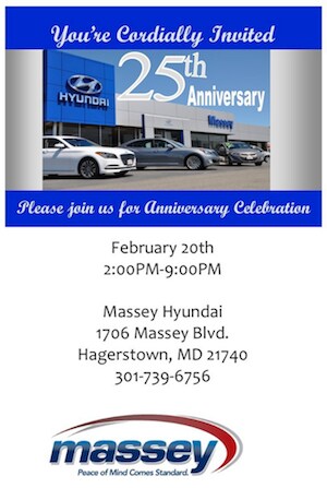 We encourage both past customers and drivers from Winchester, Chambersburg, and the surrounding communities to come celebrate with us on our dealership's 25th anniversary. Who knows? With the full lineup of Hyundai vehicles, pre-owned vehicles from a variety of automakers, and capable service and parts departments, you might see something you'll love.Our dealership is located at 1706 Massey Blvd. inHagerstown, MD. We hope you'll come celebrate with us!