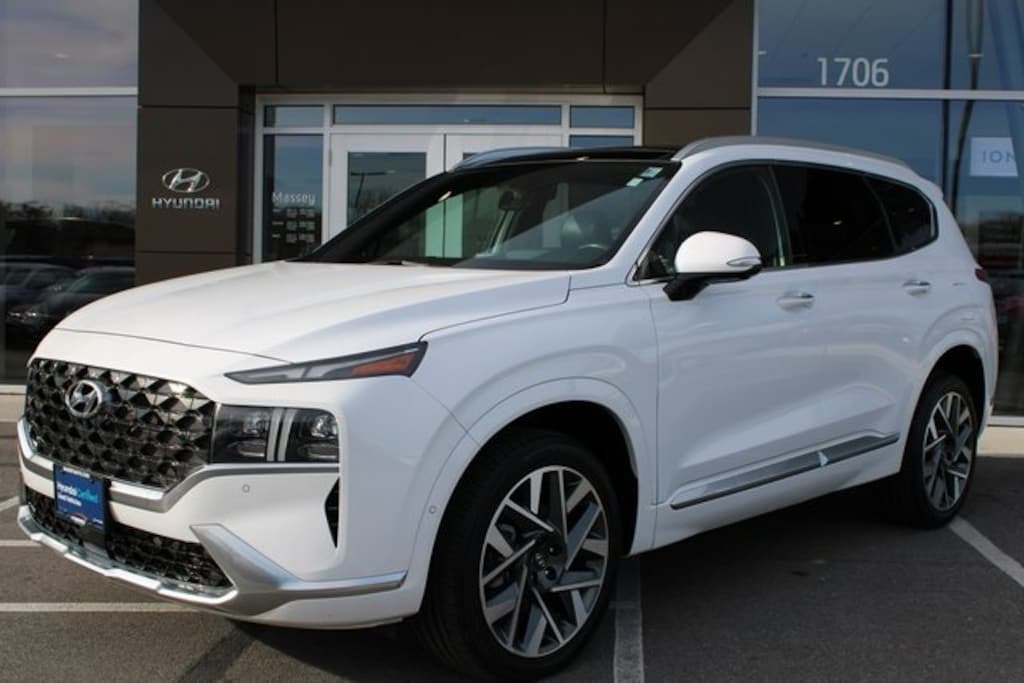 Recent Arrival! Clean CARFAX. 21/28 City/Highway MPG 2023 Hyundai Santa Fe Calligraphy Serenity White Pearl AWD 2.5L I4 Shiftronic Calligraphy AWD, Black Leather, 12 Speakers, 4-Wheel Disc Brakes, ABS brakes, Air Conditioning, Alloy wheels, AM/FM radio: SiriusXM, Apple CarPlay & Android Auto, Auto High-beam Headlights, Auto-dimming Rear-View mirror, Automatic temperature control, Axle Ratio: 3.316, Brake assist, Bumpers: body-color, Delay-off headlights, Driver door bin, Driver vanity mirror, Dual front impact airbags, Dual front side impact airbags, Electronic Stability Control, Emergency communication system, Exterior Parking Camera Rear, Four wheel independent suspension, Front anti-roll bar, Front Bucket Seats, Front Center Armrest, Front dual zone A/C, Front reading lights, Fully automatic headlights, Garage door transmitter: HomeLink, harman/kardon® Speakers, Heads-Up Display, Heated & Ventilated Front Bucket Seats, Heated door mirrors, Heated front seats, Heated rear seats, Heated steering wheel, Illuminated entry, Leather steering wheel, Low tire pressure warning, Memory seat, Navigation System, Occupant sensing airbag, Option Group 01, Outside temperature display, Overhead airbag, Overhead console, Panic alarm, Passenger door bin, Passenger vanity mirror, Power door mirrors, Power driver seat, Power Liftgate, Power moonroof, Power passenger seat, Power steering, Power windows, Quilted Premium Nappa Leather Seat Trim, Radio: AM/FM Harman Kardon Display Audio, Rain sensing wipers, Rear anti-roll bar, Rear seat center armrest, Rear window defroster, Rear window wiper, Remote keyless entry, Security system, Speed control, Speed-sensing steering, Split folding rear seat, Spoiler, Steering wheel mounted audio controls, Tachometer, Telescoping steering wheel, Tilt steering wheel, Traction control, Trip computer, Turn signal indicator mirrors, Variably intermittent wipers, Ventilated front seats, Wheels: 20" x 8.0J Alloy, AWD, Black Leather. Call (301) 739-6756 or send an email to sales@masseyauto.com to confirm availability!